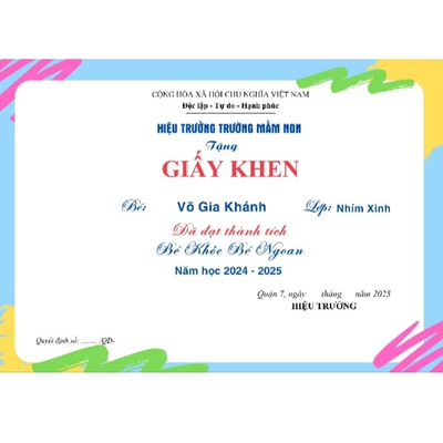 Giấy khen, chứng chỉ được thiết kế trang trọng, in ấn sắc nét trên chất liệu giấy cao cấp, giúp ghi nhận thành tích, tôn vinh giá trị và tạo dấu ấn chuyên nghiệp.